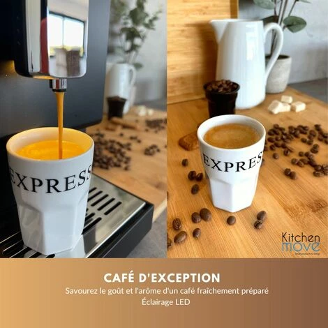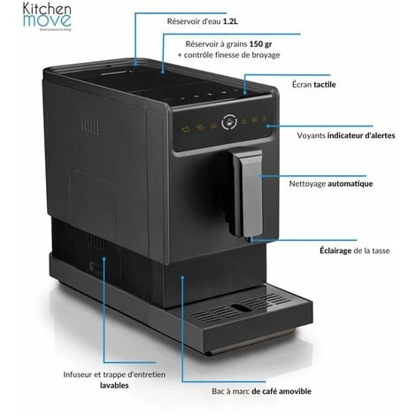 - Savourez le goût et l’arôme d’un café préparé facilement grâce à l’écran tactile intuitif. Avec son réservoir de 150 g, vous n’aurez pas besoin de rajouter des grains de café à chaque fois que vous souhaitez vous servir de l’appareil. De plus, elle est équipée d’un réservoir d’eau de 1,2 L, soit le volume nécessaire pour remplir 30 tasses d’expresso